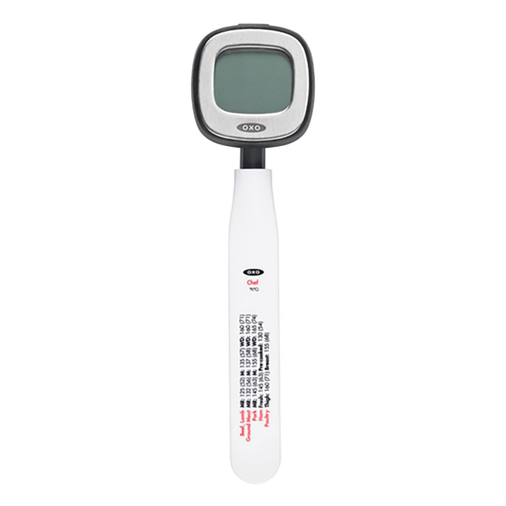 OXO dijital termometre, aşçıları yemeği takip etme zahmetinden kurtarıyor. Doğru bir okuma için yalnızca bir düğmeye basmak yeterli. İnce çubuk ete yerleştiriliyor ve Fahrenheit ya da Santigrat cinsinden sonuca anında ulaşılıyor. Büyük rakamlar kolayca okunabiliyor. Saklama kılıfının üzerinde ise tavsiye edilen sıcaklıklar yer alıyor.